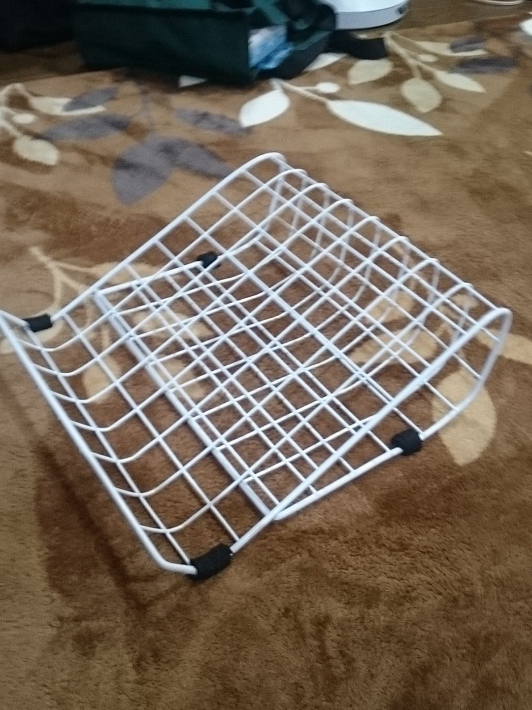 タキタ ダイソーで150円で買ったワイヤーネットを 渾身の力で曲げて作った ノートパソコン用スタンドですw 接地する場所には 車のダッシュボードに敷く滑り止め これもダイソーで100円 を巻き付けてます T Co
